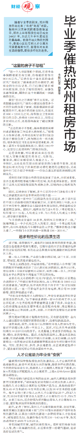 随着毕业季的到来,郑州租房市场迎来了年度“高温”时段。据郑州贝壳研究院最新数据显示,郑州上半年租赁住宅已成交34431单,为近几年半年度成交的最高峰。租房市场火热的氛围中,普通小区住宅和人才公寓共同承载着新市民、新青年对未来生活的憧憬,提供多样化的选择。(今日《郑州日报》6版)