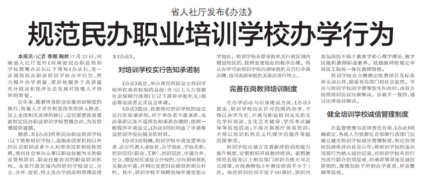 7月23日,河南省人社厅发布《河南省民办职业培训学校管理办法》,进一步规范民办职业培训学校办学行为,努力提升办学质量,更好地服务于高质量充分就业和经济社会发展对技能人才培养的需要。(今日《郑州日报》7版)