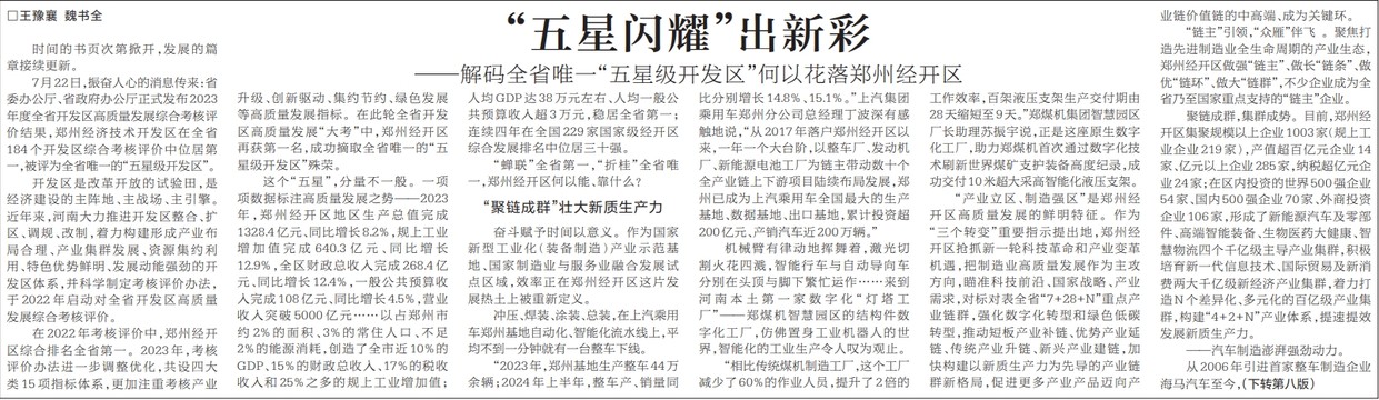 7月22日,振奋人心的消息传来:省委办公厅、省政府办公厅正式发布2023年度全省开发区高质量发展综合考核评价结果,郑州经济技术开发区在全省184个开发区综合考核评价中位居第一,被评为全省唯一的“五星级开发区”。(今日《河南日报》1版、8版)