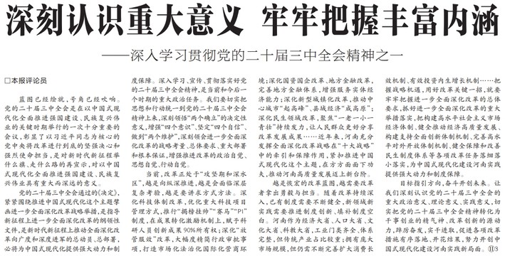 蓝图已经绘就,号角已经吹响。党的二十届三中全会是在以中国式现代化全面推进强国建设、民族复兴伟业的关键时期举行的一次十分重要的会议,彰显了以习近平同志为核心的党中央将改革进行到底的坚强决心和强烈使命担当,是对新时代新征程举什么旗、走什么路的再宣示,对以中国式现代化全面推进强国建设、民族复兴伟业具有重大而深远的意义。(今日《河南日报》2版)