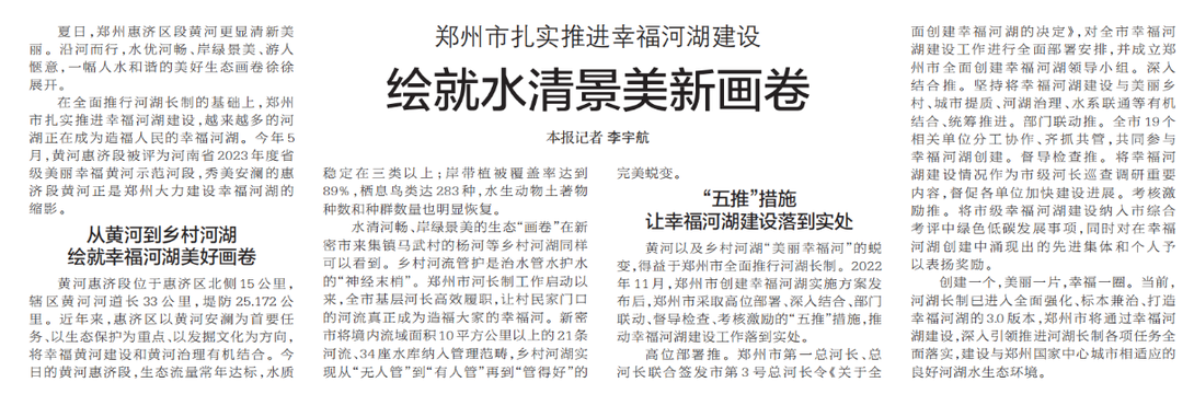 在全面推行河湖长制的基础上,郑州市扎实推进幸福河湖建设,越来越多的河湖正在成为造福人民的幸福河湖。今年5月,黄河惠济段被评为河南省2023年度省级美丽幸福黄河示范河段,秀美安澜的惠济段黄河正是郑州大力建设幸福河湖的缩影。(今日《郑州日报》2版)