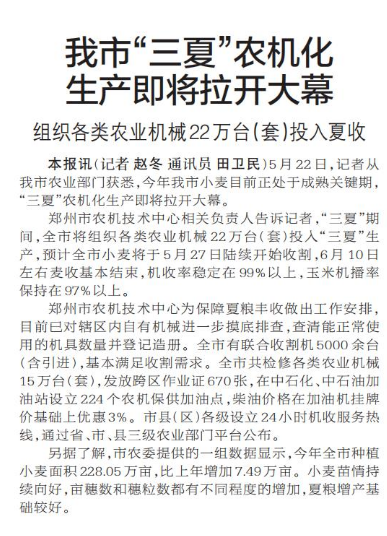 5月22日,记者从我市农业部门获悉,今年我市小麦目前正处于成熟关键期,“三夏”农机化生产即将拉开大幕。(今日《郑州日报》1版)