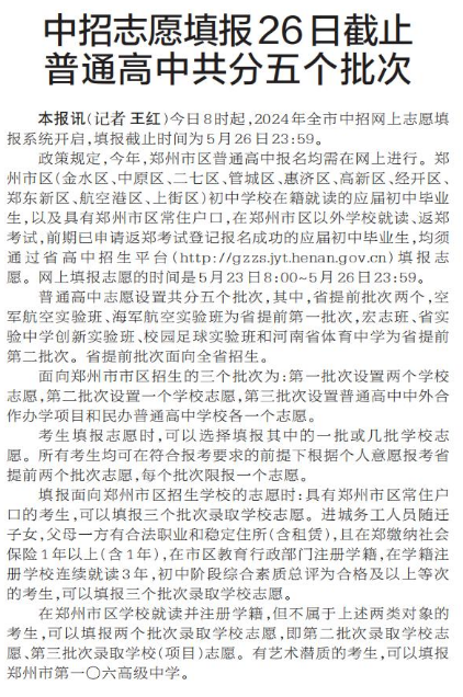 今日8时起,2024年全市中招网上志愿填报系统开启,填报截止时间为5月26日23:59。(今日《郑州日报》2版)