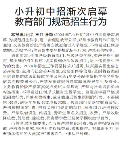 2024年“小升初”及中招即将渐次启幕,为规范招生秩序,进一步促进教育公平,郑州市教育局昨日发布通知:义务教育阶段严格落实就近免试入学规定,不得通过任何形式擅自选拔学生;普通高中要严格规范招生行为,严禁有偿招生。(今日《郑州日报》2版)