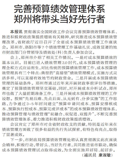 完善预算绩效管理体系 郑州将带头当好先行者
