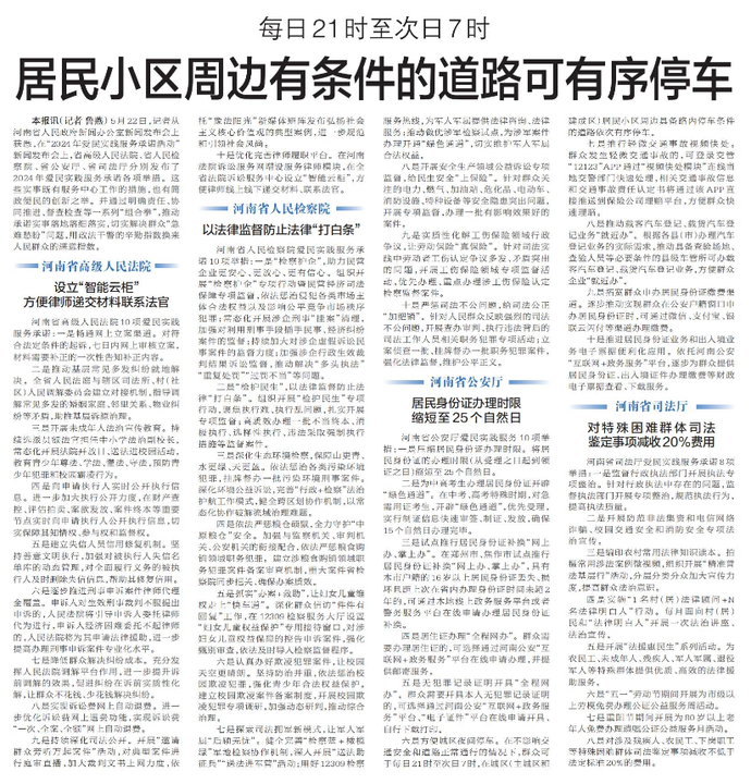 5月22日,记者从河南省人民政府新闻办公室新闻发布会上获悉,在“2024年爱民实践服务承诺活动”新闻发布会上,省高级人民法院、省人民检察院、省公安厅、省司法厅分别发布了2024年爱民实践服务承诺各项举措。这些实事既有服务中心工作的措施,也有简政便民的创新之举。并通过明确责任、协同推进、督查检查等一系列“组合拳”,推动承诺实事落地落细落实,切实解决群众“急难愁盼”问题,用政法干警的辛勤指数换来人民群众的满意指数。(今日《郑州日报》5版)