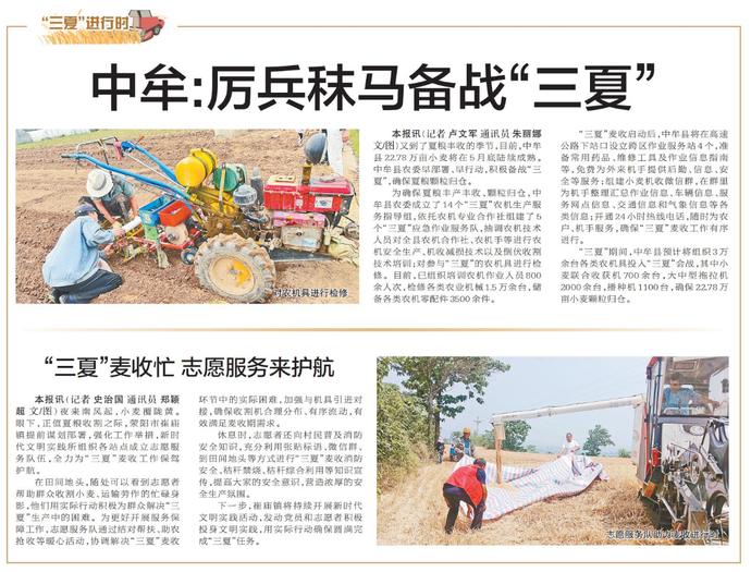 夜来南风起,小麦覆陇黄。眼下,正值夏粮收割之际,荥阳市崔庙镇提前谋划部署,强化工作举措,新时代文明实践所组织各站点成立志愿服务队伍,全力为“三夏”麦收工作保驾护航。(今日《郑州日报》7版)
