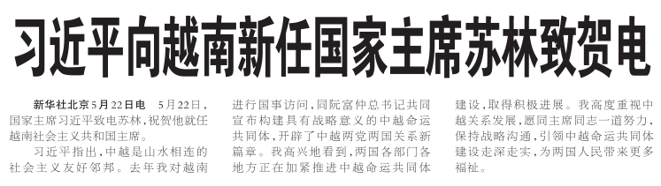5月22日,国家主席习近平致电苏林,祝贺他就任越南社会主义共和国主席。(今日《人民日报》1版)
