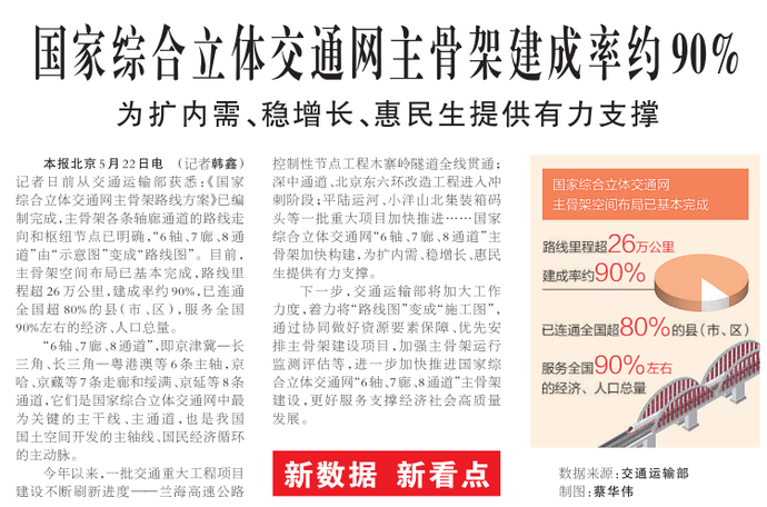 国家综合立体交通网主骨架建成率约90%