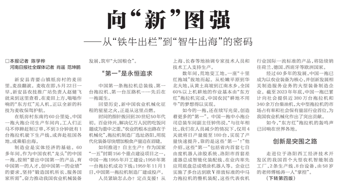 制造业是实体经济的基础。60多年间,作为中国农机“龙头”的中国一拖,按照“要出中国第一的产品,育中国第一的人才,创中国第一的业绩”的要求,坚持“锻造国机所长、服务国家所需”,奋力推动我国农业机械装备发展,筑牢“大国粮仓”。(今日《河南日报》1版、4版)