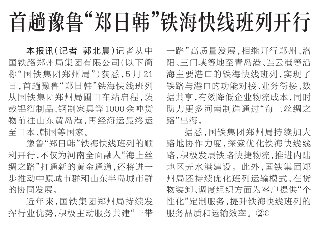 记者从中国铁路郑州局集团有限公司(以下简称“国铁集团郑州局”)获悉,5月21日,首趟豫鲁“郑日韩”铁海快线班列从国铁集团郑州局圃田车站启程,装载铝箔制品、钢制家具等1000余吨货物前往山东黄岛港,再经海运最终运至日本、韩国等国家。(今日《河南日报》1版)