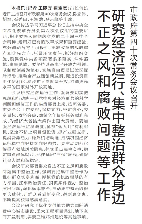 市长何雄近日主持召开市政府第40次常务会议,陈宏伟、胡军、石秀田、王鸿勋、马志峰等出席。(今日《郑州日报》1版)
