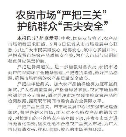 中秋、国庆双节将至,农产品市场消费需求旺盛。9月6日记者从市市场发展中心获悉,为让广大市民买得放心、吃得安心,该中心多措并举,严把农贸市场农产品质量安全关,为广大市民节日期间餐桌供应保驾护航。(今日《郑州日报》1版)