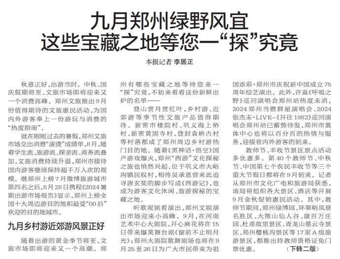 秋意正好,出游当时。中秋、国庆假期将至,文旅市场即将迎来又一个消费高峰。郑州文旅推出9月份值得期待的文旅惠民活动,为国内外游客奉上一份游玩与消费的“热度指南”。(今日《郑州日报》1版、2版)