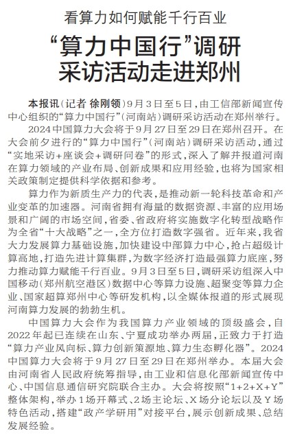 9月3日至5日,由工信部新闻宣传中心组织的“算力中国行”(河南站)调研采访活动在郑州举行。(今日《郑州日报》2版)