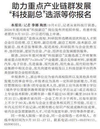 9月6日,记者从省科技厅获悉,2024年度河南省“科技副总” 岗位发布并组织申报。有意申报者需在9月10日~27日进行线上申请。(今日《郑州日报》2版)