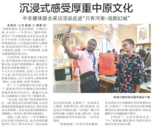 “金黄的麦田,生长在家园。在那河之南,在人间……”9月6日,“漫步中国·郑州行”中非媒体联合采访活动走进位于中牟的“只有河南·戏剧幻城”。伴随着景区上空悠扬回荡的主题歌曲,参加活动的中非记者穿梭于一个个剧场间,观看一个个河南故事,沉浸式感受厚重中原文化。(今日《郑州日报》2版)