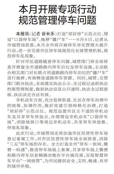 打造“郑好停”示范点位、增设“口袋停车场”、拖移“僵尸车”……9月6日,记者从市城管局获悉,本月全市将开展停车序化管理大提升行动,进一步完善市区停车场规范化长效管理机制,规范停车乱现象。(今日《郑州日报》2版)