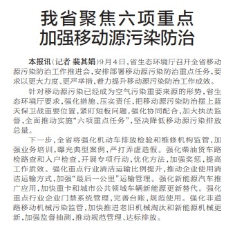 9月4日,省生态环境厅召开全省移动源污染防治工作推进会,安排部署移动源污染防治重点任务,要求以更大力度、更严举措,着力提升移动源污染防治工作成效。(今日《郑州日报》2版)
