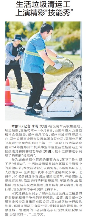 垃圾装车及收集整理、垃圾倾倒、直角转弯……9月6日,由郑州市人力资源和社会保障局、郑州市总工会、郑州市城市管理局主办,郑州公用事业投资发展集团有限公司、郑州公用环卫有限公司承办的郑州市第二十一届职工技术运动会暨2024年度郑州市机关事业单位生活垃圾清运工岗位技能竞赛决赛成功举办,数十位参赛选手展现了精彩的“技能秀”。(今日《郑州日报》2版)