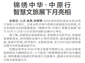 2024郑州国际商品交易会将于金秋十月举行。记者从昨日举行的相关新闻发布会获悉,作为本届郑交会的重要板块,“锦绣中华·中原行 智慧文旅展”将于10月11日至13日在郑州国际会展中心举办。(今日《郑州日报》2版)