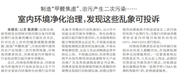近期央视、新华网及光明网对国内部分室内环境治理行业乱象的曝光引起社会关注,针对社会上存在的随意调整检测数据,制造“甲醛焦虑”,污染治理中使用伪劣产品导致二次污染的现象,河南省消费者协会、河南省室内环境净化行业协会即日起开展专项整治。(今日《郑州日报》2版)