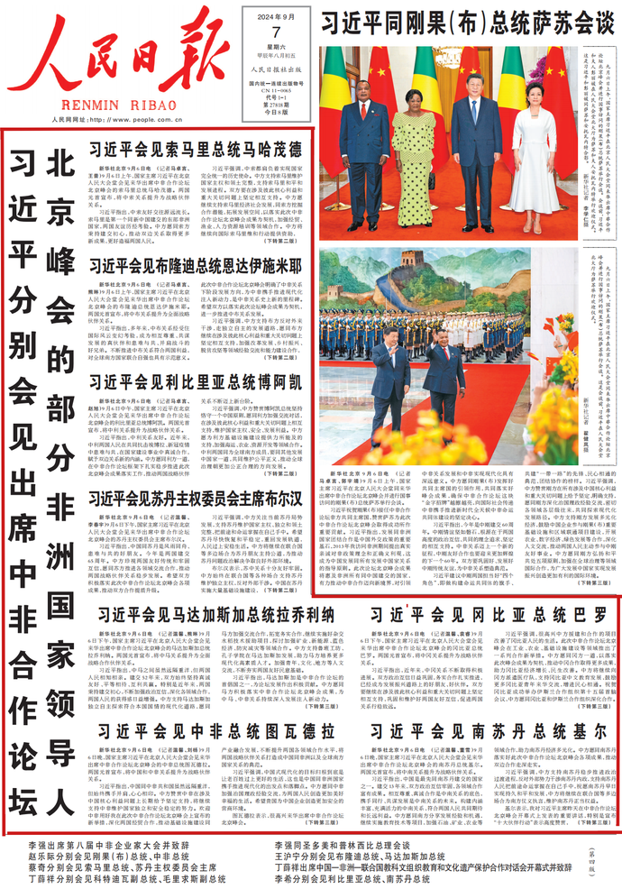 9月6日上午,国家主席习近平在北京人民大会堂会见来华出席中非合作论坛北京峰会的布隆迪总统恩达伊施米耶。两国元首宣布,将中布关系提升为全面战略伙伴关系。(今日《人民日报》1版、2版)