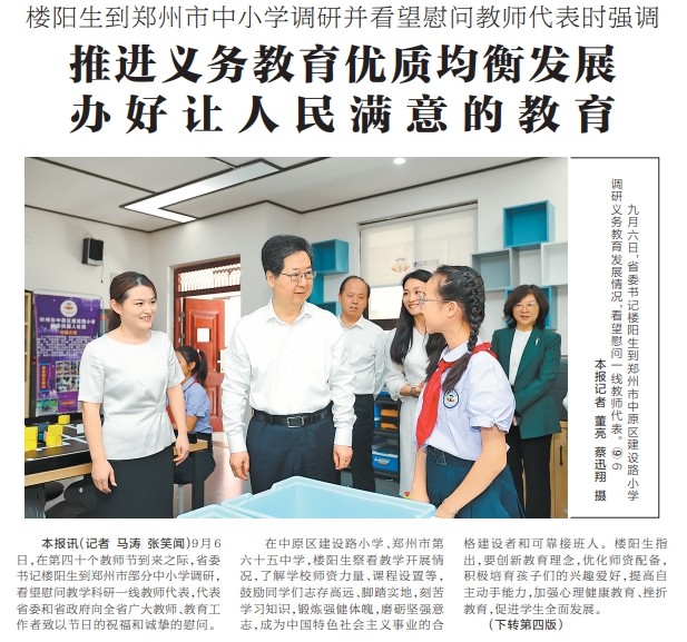 9月6日,在第四十个教师节到来之际,省委书记楼阳生到郑州市部分中小学调研,看望慰问教学科研一线教师代表,代表省委和省政府向全省广大教师、教育工作者致以节日的祝福和诚挚的慰问。(今日《河南日报》1版、4版)