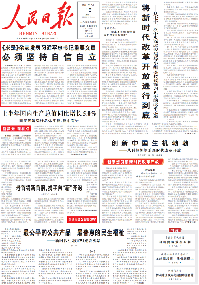 7月16日出版的第14期《求是》杂志将发表中共中央总书记、国家主席、中央军委主席习近平的重要文章《必须坚持自信自立》。这是习近平总书记2013年1月至2024年3月期间有关重要论述的节录。