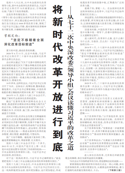 这是改革的催征鼓点。72次中央深改委(领导小组)会议锚定全面深化改革总目标进行顶层设计,审议通过超过600份改革文件,指引各方面出台3000多项改革方案,展现了习近平总书记逢山开路、遇水架桥的改革精神和不断发展、日臻精深的改革之道。(今日《人民日报》1版、3版)