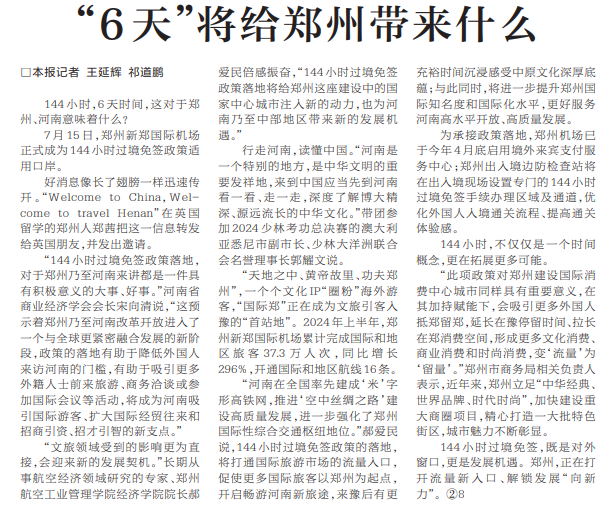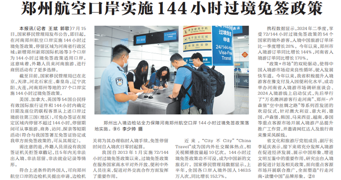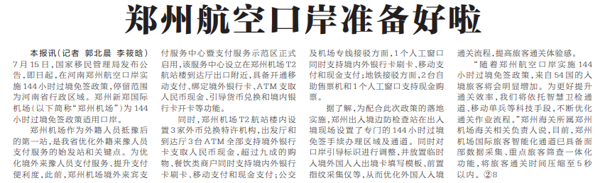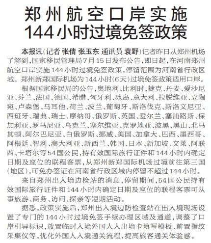 有个振奋人心的好消息,相信你也看到了,7月15日,国家移民管理局发布公告称,即日起,在河南郑州航空口岸实施144小时过境免签政策,停留范围为河南省行政区域。新增郑州新郑国际机场为144小时过境免签政策适用口岸。(今日《郑州日报》6版)