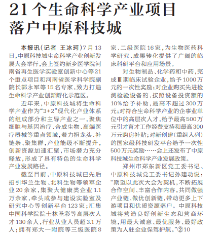 7月13日,中原科技城生命科学产业创新发展大会举行,会上签约新乡医学院河南省再生医学实验室创新中心等21个重点项目和河南省医学科学院副院长郭永军等15名专家,致力打造生命科学产业创新孵化示范区。(今日《河南日报》2版)