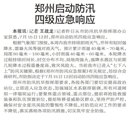 记者昨日从市防汛抗旱指挥部办公室获悉,7月15日12时,郑州启动防汛四级应急响应。(今日《郑州日报》1版)