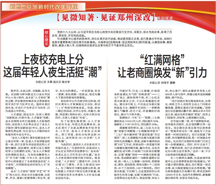 作为国家中心城市的郑州市,深化改革开放不动摇,推动更深层次改革,实行更高水平开放,加快打造具有重要影响力的改革开放新高地。本报推出【见微知著·见证郑州深改】系列报道,从典型故事、典型案例、典型人物入手,扫描郑州全面深化改革中的万千气象和民生百态。