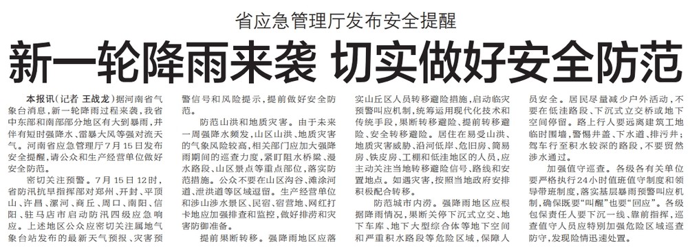 据河南省气象台消息,新一轮降雨过程来袭,我省中东部和南部部分地区有大到暴雨,并伴有短时强降水、雷暴大风等强对流天气。河南省应急管理厅7月15日发布安全提醒,请公众和生产经营单位做好安全防范。(今日《郑州日报》5版)