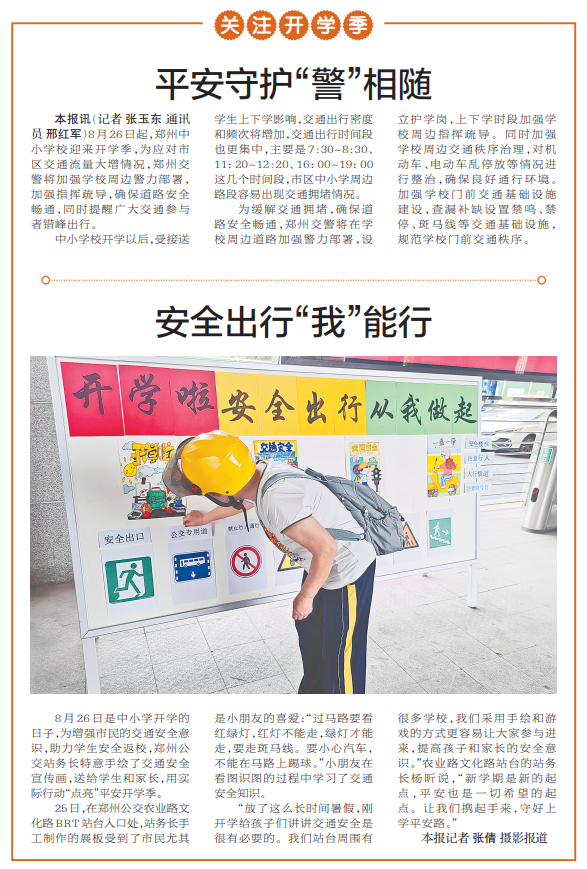 8月26日起,郑州中小学校迎来开学季,为应对市区交通流量大增情况,郑州交警将加强学校周边警力部署,加强指挥疏导,确保道路安全畅通,同时提醒广大交通参与者错峰出行。(今日《郑州日报》2版)