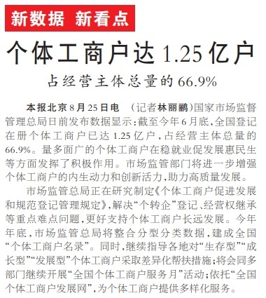 国家市场监督管理总局日前发布数据显示:截至今年6月底,全国登记在册个体工商户已达1.25亿户,占经营主体总量的66.9%。量多面广的个体工商户在稳就业促发展惠民生等方面发挥了积极作用。市场监管部门将进一步增强个体工商户的内生动力和创新活力,助力高质量发展。(今日《人民日报》1版)
