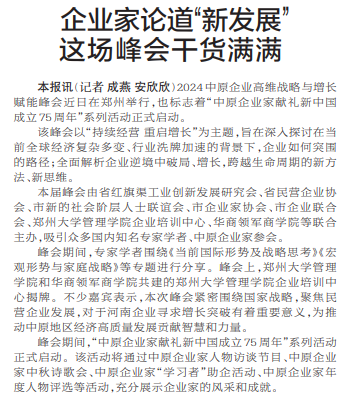 2024中原企业高维战略与增长赋能峰会近日在郑州举行,也标志着“中原企业家献礼新中国成立75周年”系列活动正式启动。(今日《郑州日报》2版)