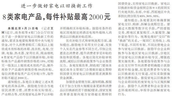近日,商务部等4部门办公厅印发关于进一步做好家电以旧换新工作的通知,要求各地要统筹使用中央与地方资金,对个人消费者购买二级及以上能效或水效标准的冰箱、洗衣机、电视、空调、电脑、热水器、家用灶具、吸油烟机8类家电产品给予以旧换新补贴,补贴标准为产品最终销售价格的15%,对购买一级及以上能效或水效的产品,额外再给予产品最终销售价格5%的补贴。每位消费者每类产品可补贴1件,每件补贴不超过2000元。(今日《人民日报》2版)