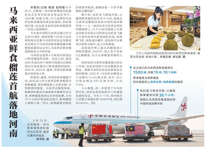 8月25日,吉隆坡—郑州鲜食榴莲首航接机仪式在郑州机场北货运区举行,1500箱、净重15吨、10个品种的马来西亚鲜食榴莲结束包机旅程,首航落地河南,这也是马来西亚鲜食榴莲第一次进入我国境内。(今日《河南日报》1版)