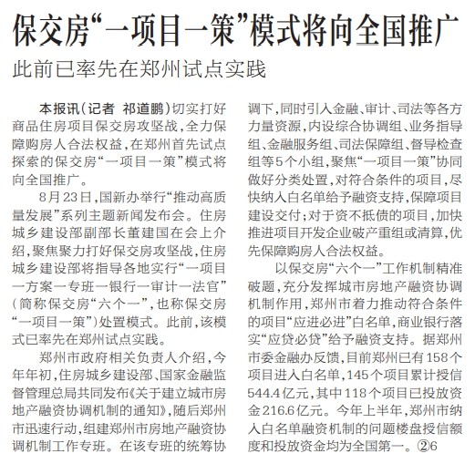 切实打好商品住房项目保交房攻坚战,全力保障购房人合法权益,在郑州首先试点探索的保交房“一项目一策”模式将向全国推广。(今日《河南日报》4版)
