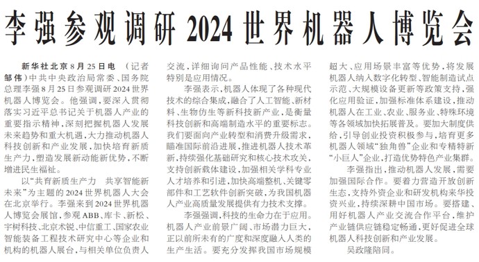 中共中央政治局常委、国务院总理李强8月25日参观调研2024世界机器人博览会。他强调,要深入贯彻落实习近平总书记关于机器人产业的重要指示精神,深刻把握机器人发展未来趋势和重大机遇,大力推动机器人科技创新和产业发展,加快培育新质生产力,塑造发展新动能新优势,不断增进民生福祉。(今日《人民日报》1版)