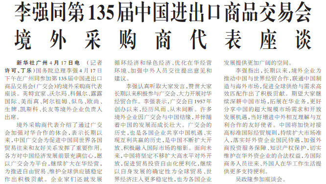 国务院总理李强4月17日下午在广州同参加第135届中国进出口商品交易会(广交会)的境外采购商代表座谈。英特宜家、沃尔玛、科佩尔、露露国际、美而真、阿尔祖姆、似鸟、欧尚、生牌、凯斯科、长友等境外企业负责人出席。(今日《人民日报》1版)