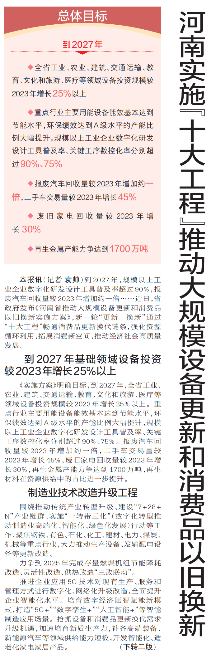 到2027年,规模以上工业企业数字化研发设计工具普及率超过90%,报废汽车回收量较2023年增加约一倍……近日,省政府发布《河南省推动大规模设备更新和消费品以旧换新实施方案》,新一轮“更新+换新”通过“十大工程”畅通消费品更新换代链条,强化资源循环利用,拓展消费新空间,推动经济社会高质量发展。(今日《郑州日报》1版、2版)