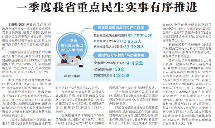4月17日,省政府办公厅通报一季度我省重点民生实事进展情况,记者了解到,我省10件重点民生实事有序推进,其中开展职业技能培训和评价取证、改善义务教育办学条件等工作超额完成阶段目标。(今日《河南日报》1版)