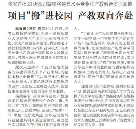 4月17日,记者从省教育厅获悉,为进一步推动职业人才培养与企业用人需求精准匹配,形成产教融合新生态,我省确定了首批职业教育(高等职业学校类)高水平专业化产教融合实训基地立项建设单位,河南水利与环境职业学院等21所高职院校入选。(今日《河南日报》1版)