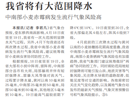 省气象台预报,受东移西南涡影响,4月18日夜里至19日,我省有一次大范围明显降水天气过程。另外,4月下旬我省还有两次降水过程,我省中南部小麦赤霉病发生流行气象风险高,建议统筹做好小麦病虫害协同防控工作。(今日《河南日报》1版)