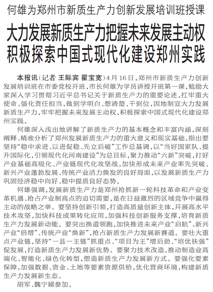 4月16日,郑州市新质生产力创新发展培训班在市委党校开班,市长何雄为学员讲授开班第一课,勉励大家深入学习贯彻习近平总书记关于新质生产力的重要论述,扛牢重大使命、强化责任担当,做到学明白、想清楚、干到位,因地制宜大力发展新质生产力,牢牢把握未来发展主动权,积极探索中国式现代化建设郑州实践。(今日《郑州日报》1版)