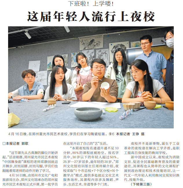4月16日晚,由郑州市文化广电和旅游局主办、郑州文化馆承办的郑州星光市民艺术夜校正式开课,第一批学员在这里开启了自己的“艺”生活。(今日《河南日报》1版、3版)