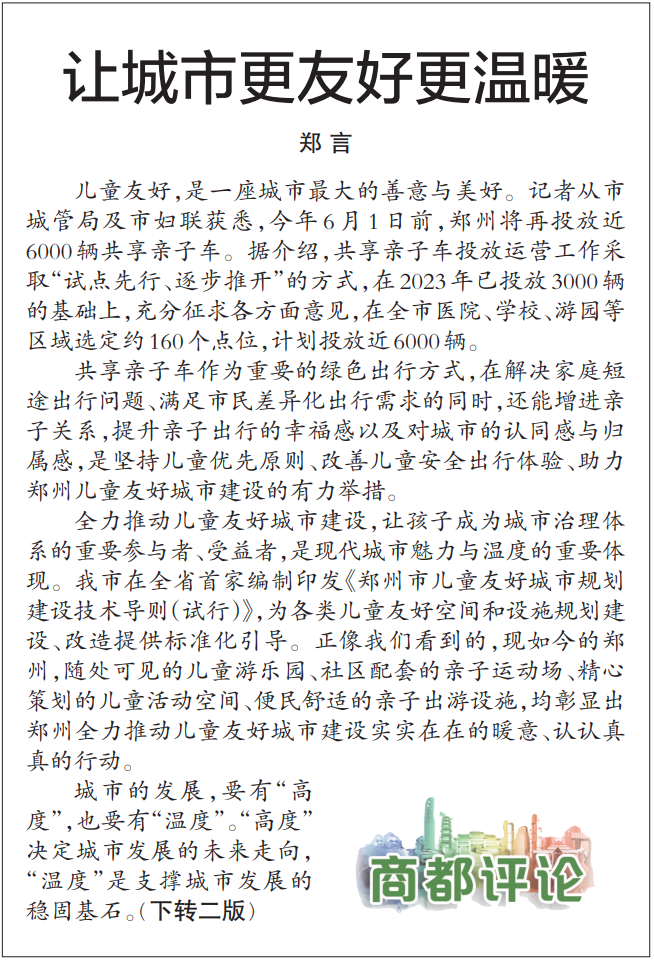 儿童友好,是一座城市最大的善意与美好。记者从市城管局及市妇联获悉,今年6月1日前,郑州将再投放近6000辆共享亲子车。据介绍,共享亲子车投放运营工作采取“试点先行、逐步推开”的方式,在2023年已投放3000辆的基础上,充分征求各方面意见,在全市医院、学校、游园等区域选定约160个点位,计划投放近6000辆。(今日《郑州日报》1版)